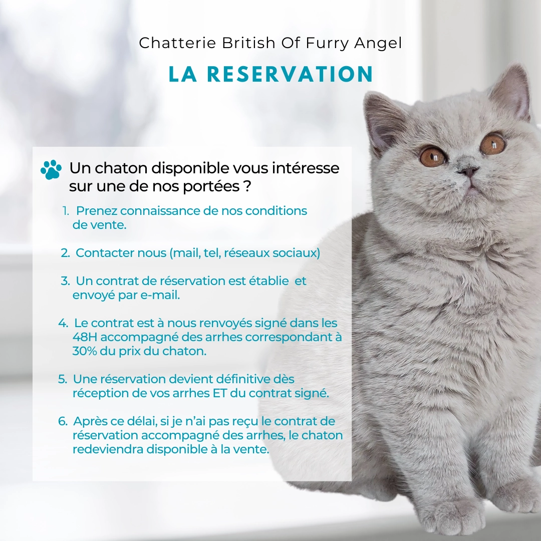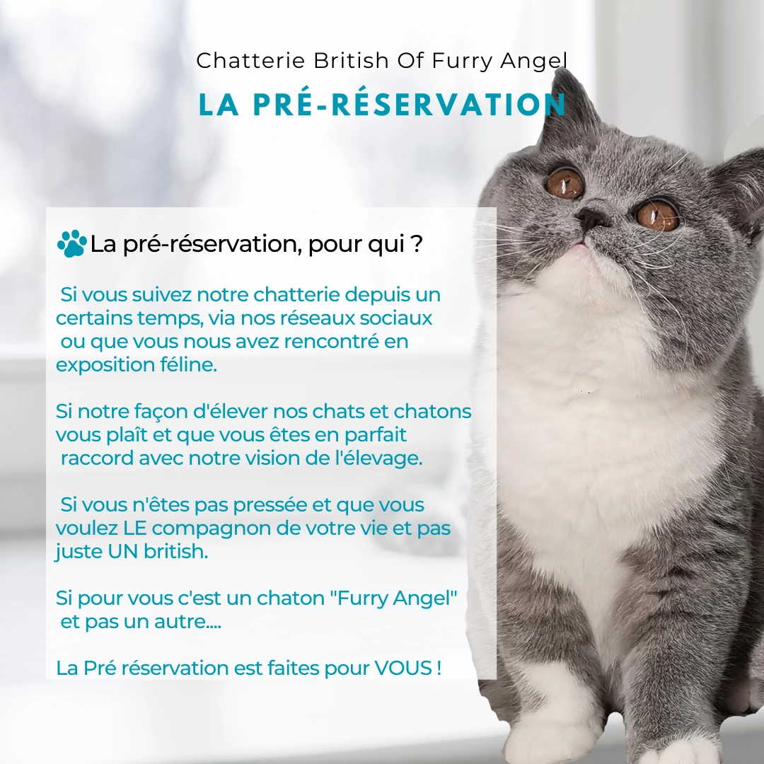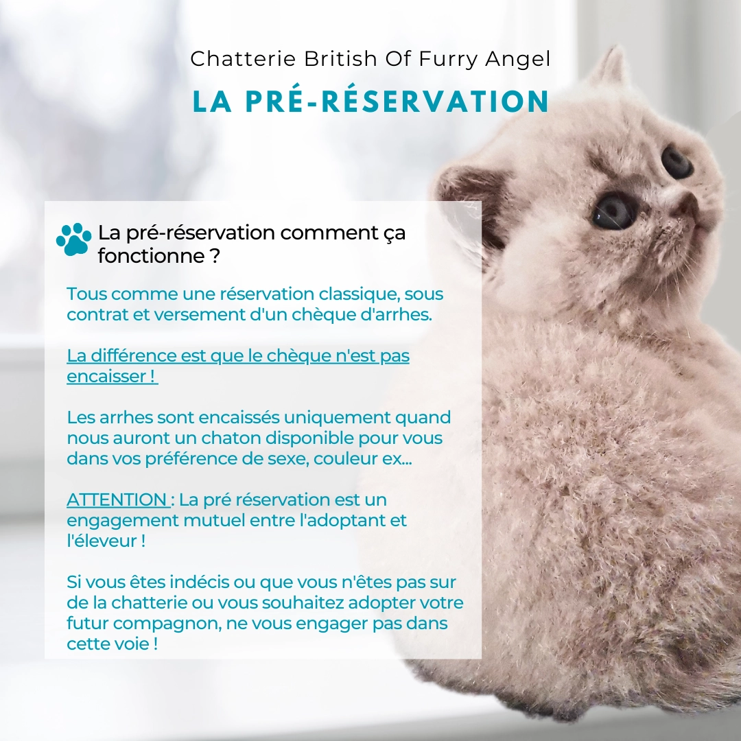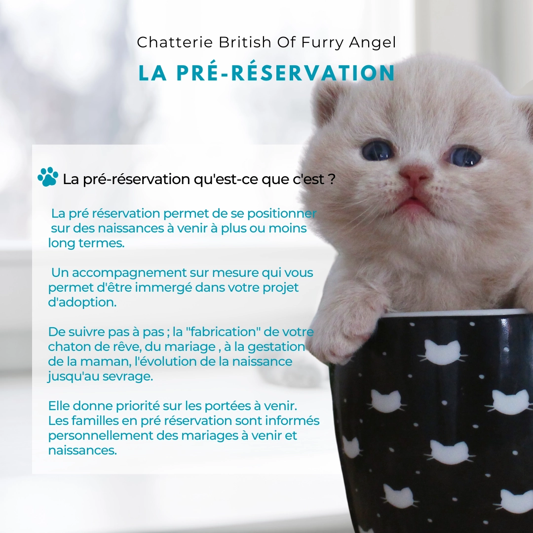 - La pré réservation vous permet d’avoir la priorité, un accompagnement sur mesure et un engagement mutuel entre nous et vous. Mais en aucun cas une obligation d’adopter le premier chaton proposé.